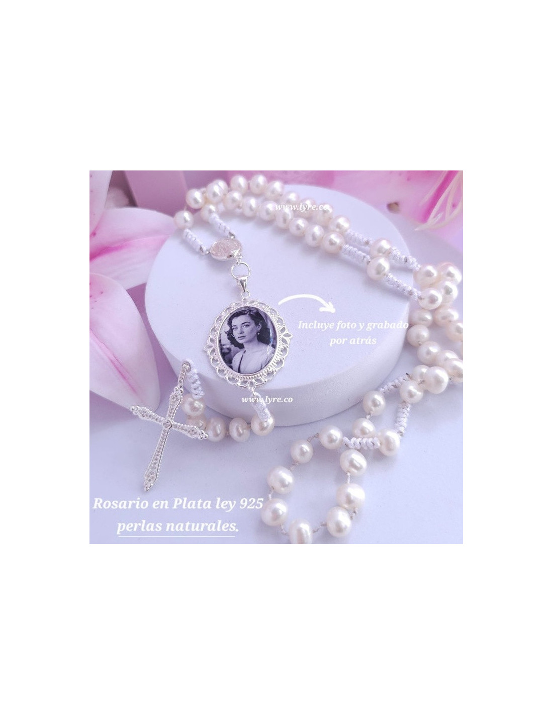 La cruz del rosario está decorada con microcircones, añadiendo un brillo sutil y elegante que realza su belleza.